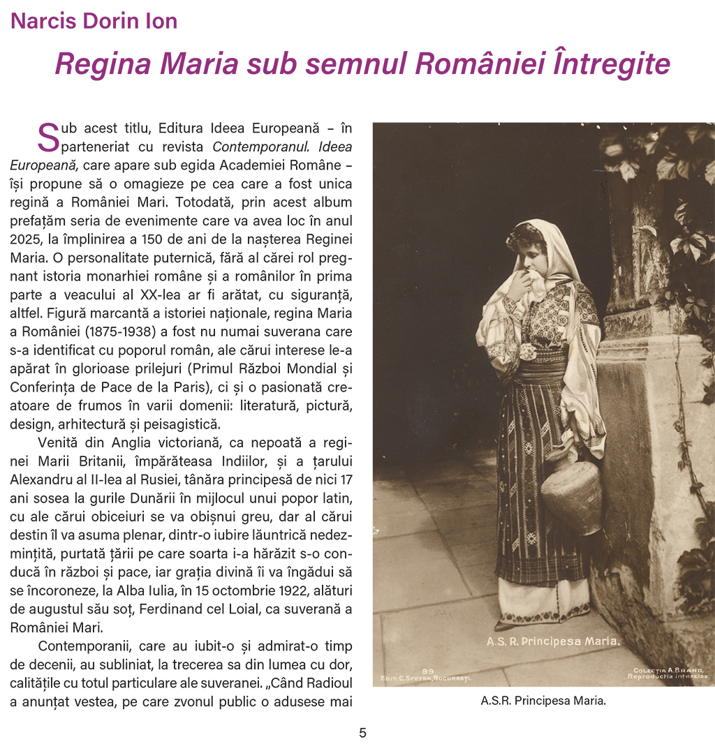 Acest volum omagial își propune să adâncească înțelegerea și aprecierea rolului Reginei Maria, un simbol al curajului, dedicării și iubirii față de România, dar și o personalitate de o frumusețe și o forță de caracter impresionante.